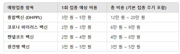 기본 예방접종 비용: 필수 예방접종 항목들은 기본적인 가격 범위를 가지며, 종합백신과 광견병 백신이 포함됩니다.