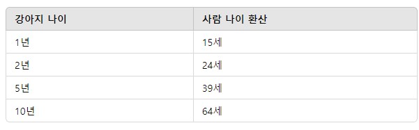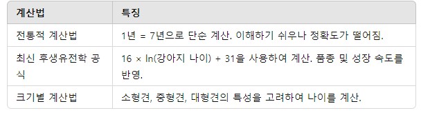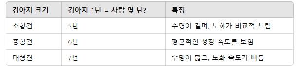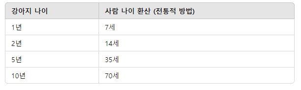 위의 표는 전통적인 계산법을 보여줍니다. 하지만 강아지의 품종과 크기에 따라 성장 속도와 수명이 다르다는 점에서 이 방법은 한계가 있었습니다.