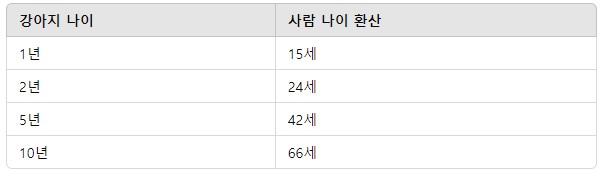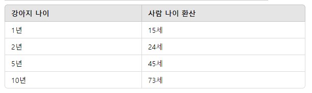강아지의 나이를 사람 나이로 환산하는 대표적인 공식은 다음과 같습니다: