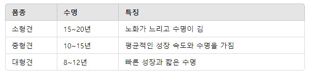 대형견은 평균적으로 8~12년의 수명을 가지며, 성장 속도와 노화가 가장 빠릅니다. 초기 2년은 사람의 약 24세에 해당하며, 이후 매년 7년씩 추가됩니다.