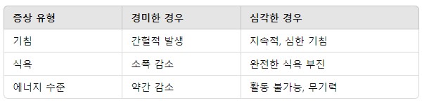 ● 식욕 저하: 목 통증과 함께 식사 시 불편함을 느끼며 식사량이 줄어듭니다.