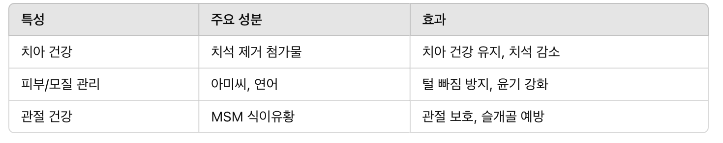 - 주요 기능: 치석 예방, 근육량 유지, 피모 건강 관리.