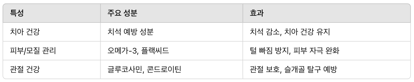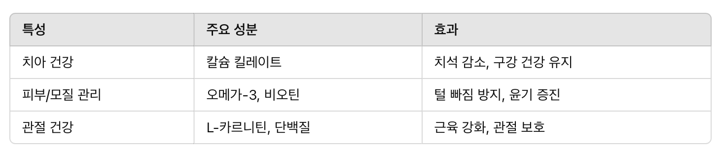 -주요 특징: 관절 건강 지원, 장 건강 강화, 피모 관리 성분 포함.