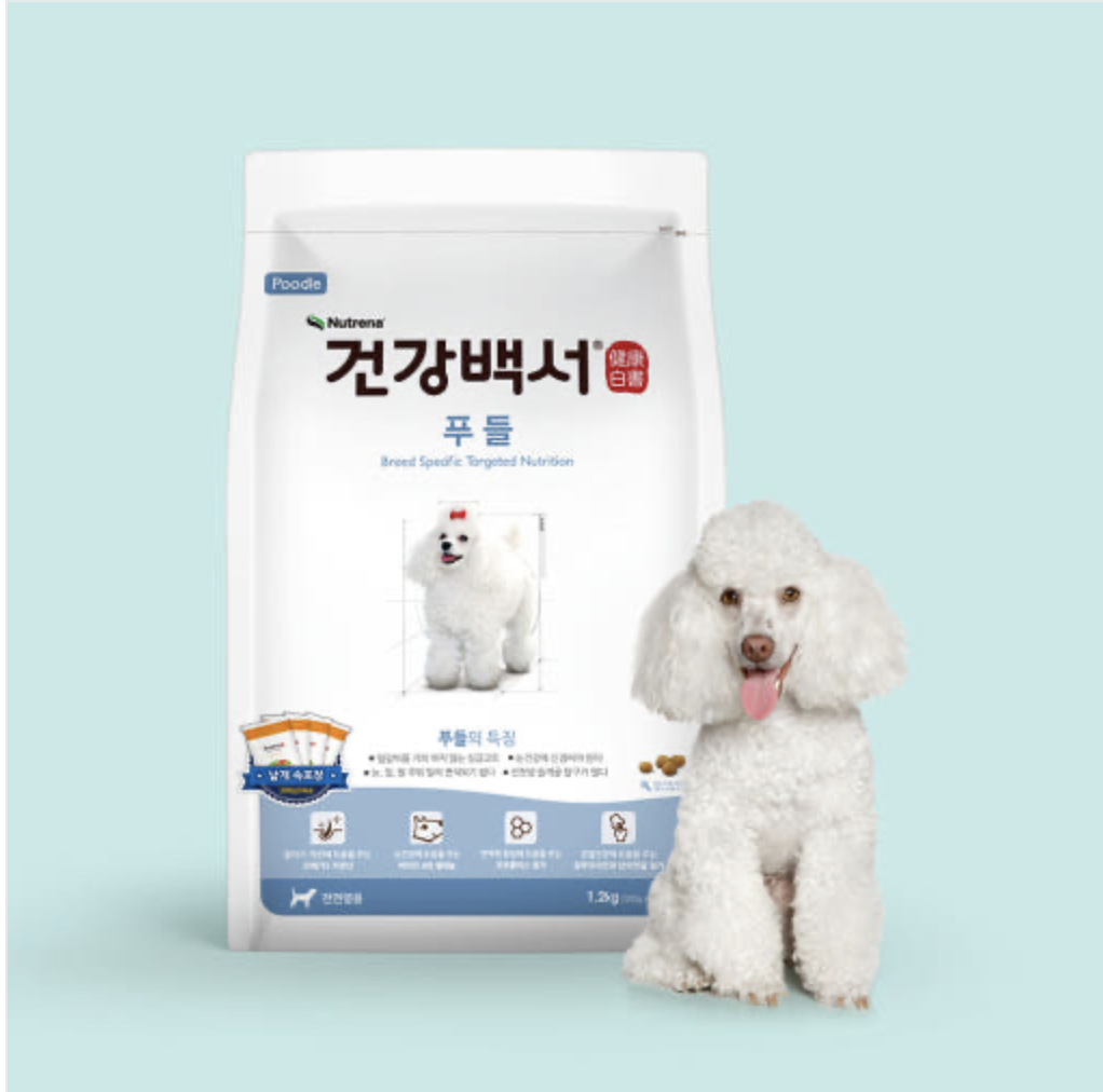 예: 로얄캐닌 푸들 사료, 카길 뉴트리나 건강백서.