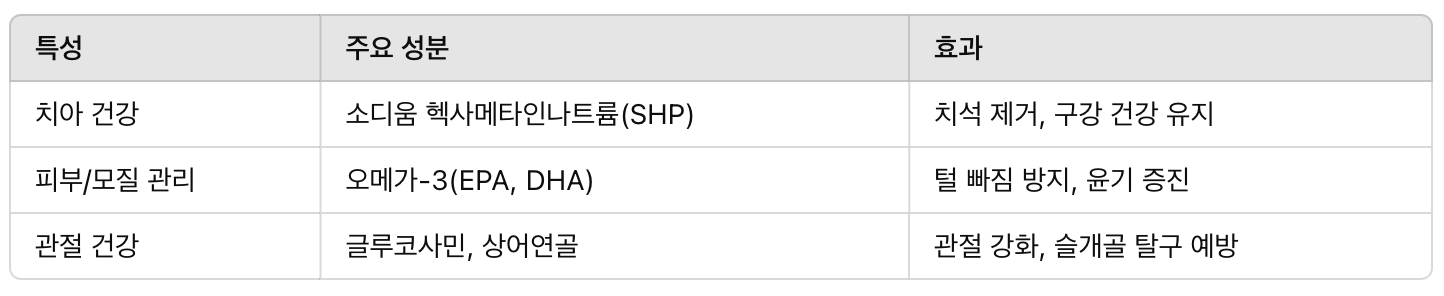 - 주요 성분: DHA, 오메가-3, 글루코사민 및 상어연골 첨가.