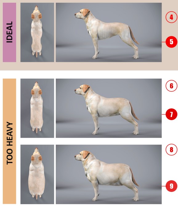 이 단계에서 강아지는 여전히 활동적일 수 있지만, 갈비뼈가 두꺼운 지방층으로 덮이기 시작하고 허리 라인이 희미해집니다. 초기 관리가 중요한 시점입니다. |